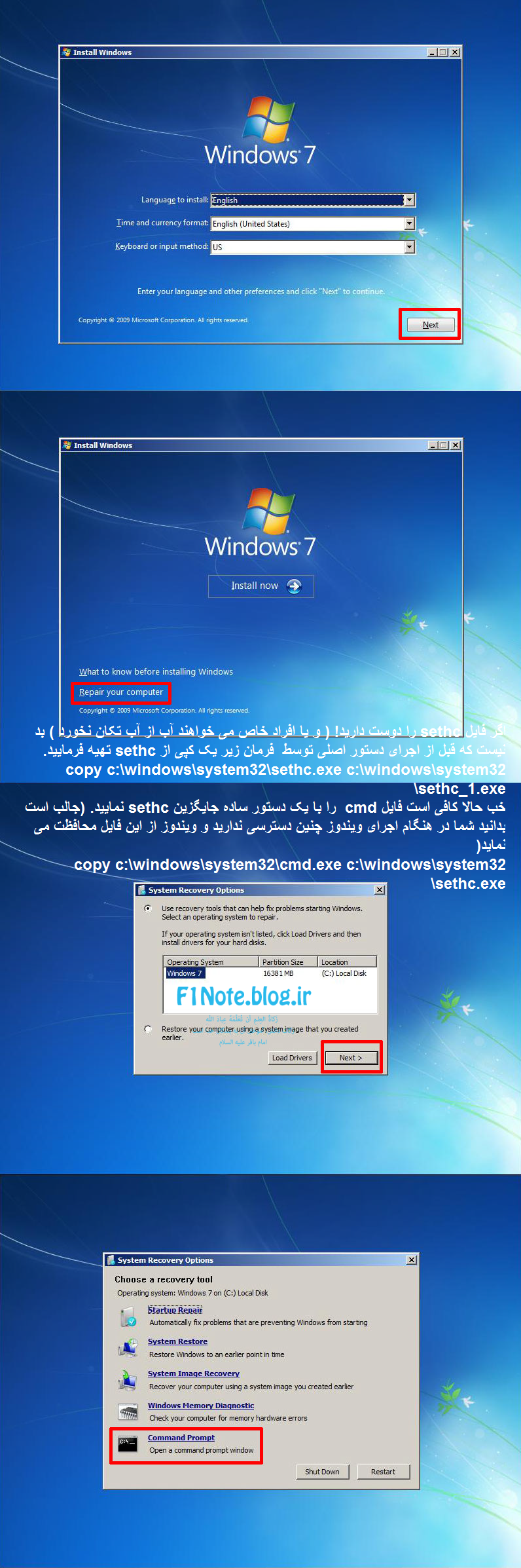 اگر قبلا طبق روش الف دستور مورد نظر را اجرا نکرده و الان پسورد خود را فراموش کرده اید (و یا افراد با نیت های شوم قصد نفوذ به ویندوز را دارند) باز هم بدون نیاز به نرم افزار کافی است کامپیوتر را با دی وی دی ویندوز ۷ بوت کرده و مراحل نصب را آغاز نمایید و مطابق تصاویر زیر ادامه دهید: